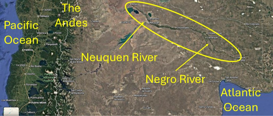 Cahors has predominantly limestone soils while Valle de Uco in Mendoza has alluvial soils composed of loam, sand, stones and gravel, and Neuquen in Patagonia has rmostly iver bed gravel. All these soils are very suitable for quality viticulture with the soils in Argentina poor in nutrients and with good drainage stimulating the growth of deep root systems. In addition, the lack of rain in Neuquen makes irrigation a necessity and prevents fungal disease making it ideal for organic agriculture. See map of the Patagonia wine region as a river-base oasis surrounded by desertic Patagonia landscape: