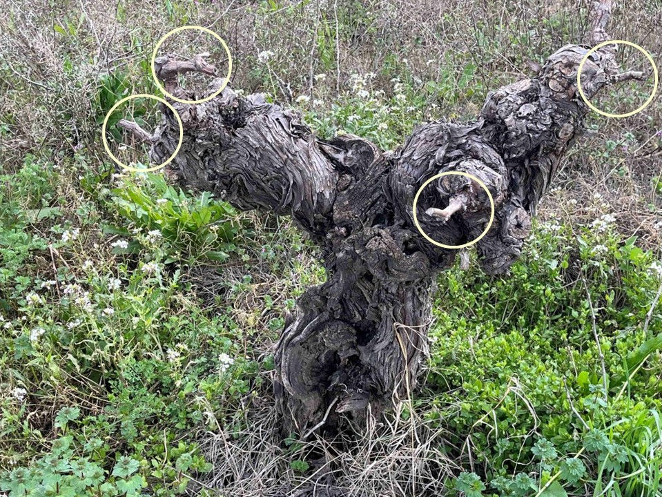 Notice how these vines are pruned. In the one below only 4 short shoots were left. This practice reduces the yield to ensure that the few grape bunches that the vine will produce will have intense aromas