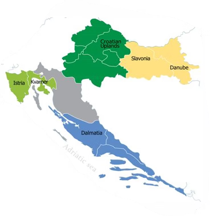 Croatia is divided in four distinct regions, each with its own climate and soils. The two inland regions have continental climate while the two in the Adriatic Coast have Mediterranean climate.